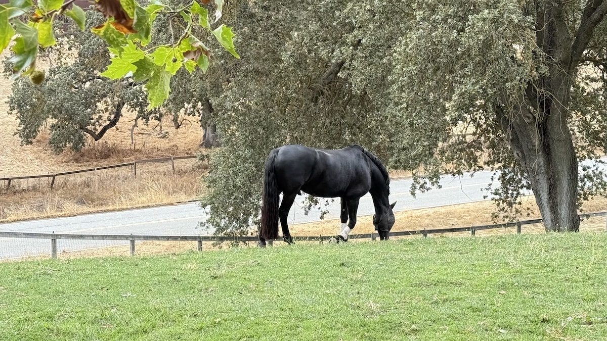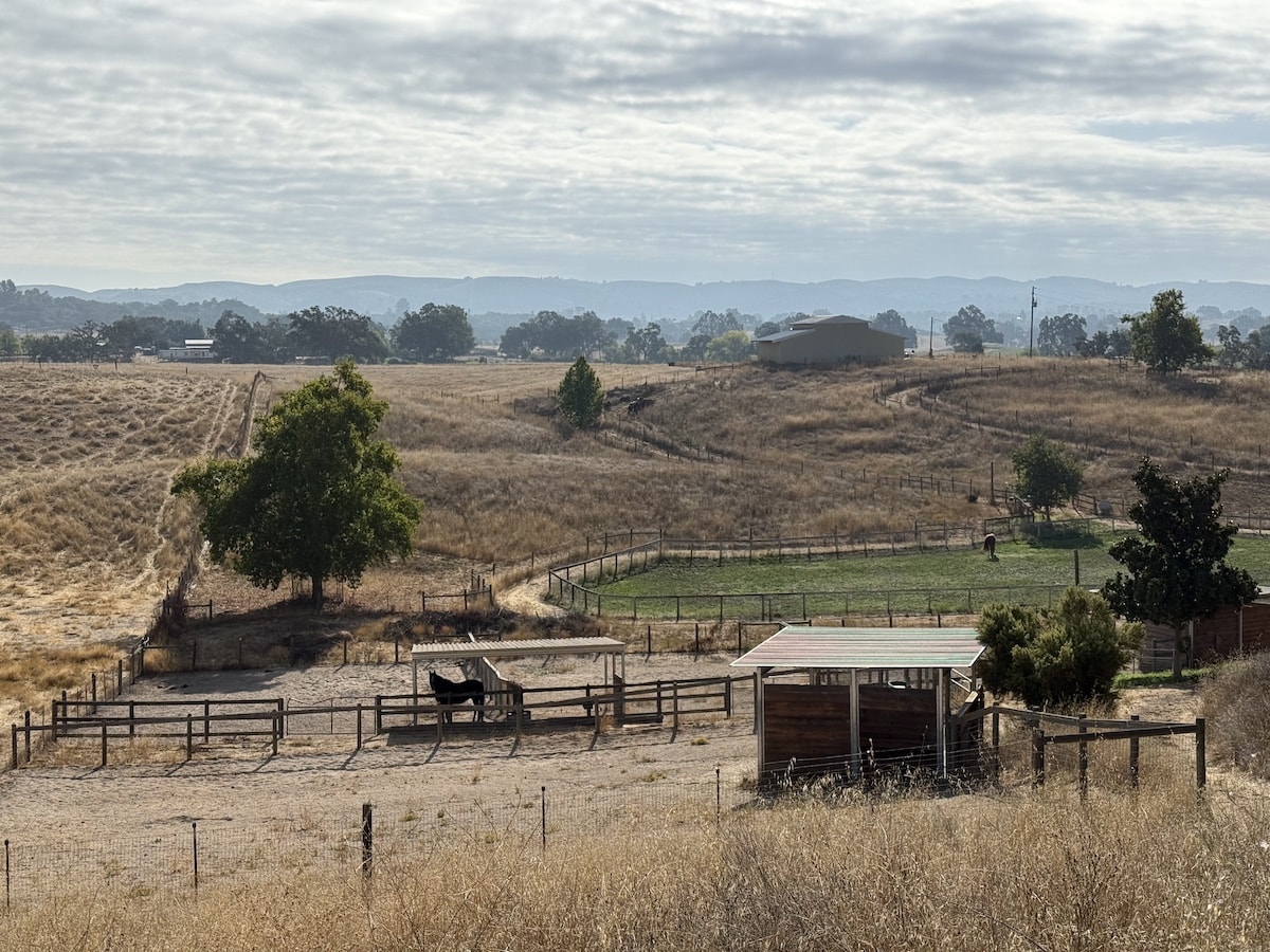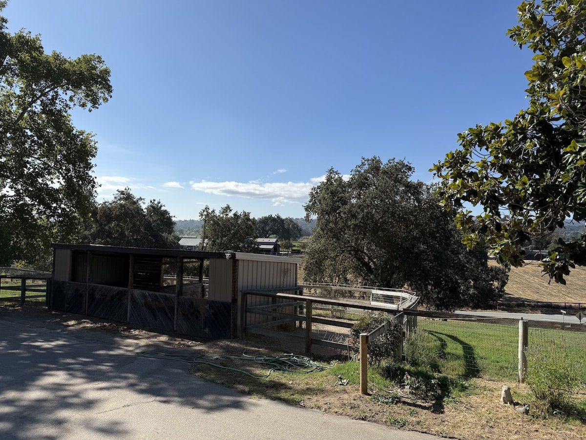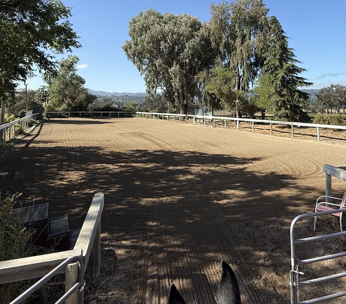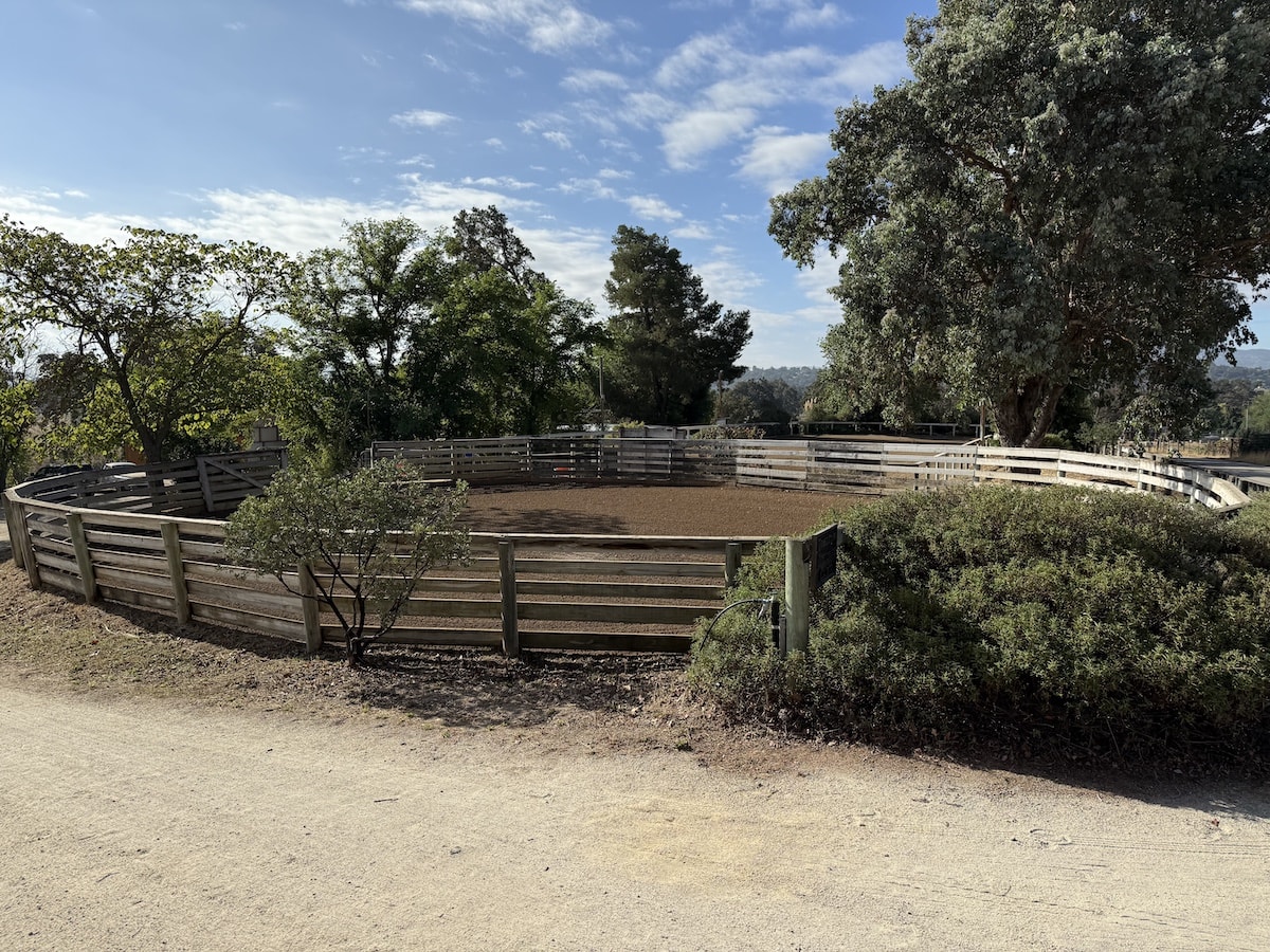 The arena has all- weather sand and rubber footing , is fenced, and has gorgeous views. The round corral is large and very useful for ground work and riding young or inexperienced horses. Our track is lovely and suitable for a leisurely trail ride, or for warm up-cool downs.